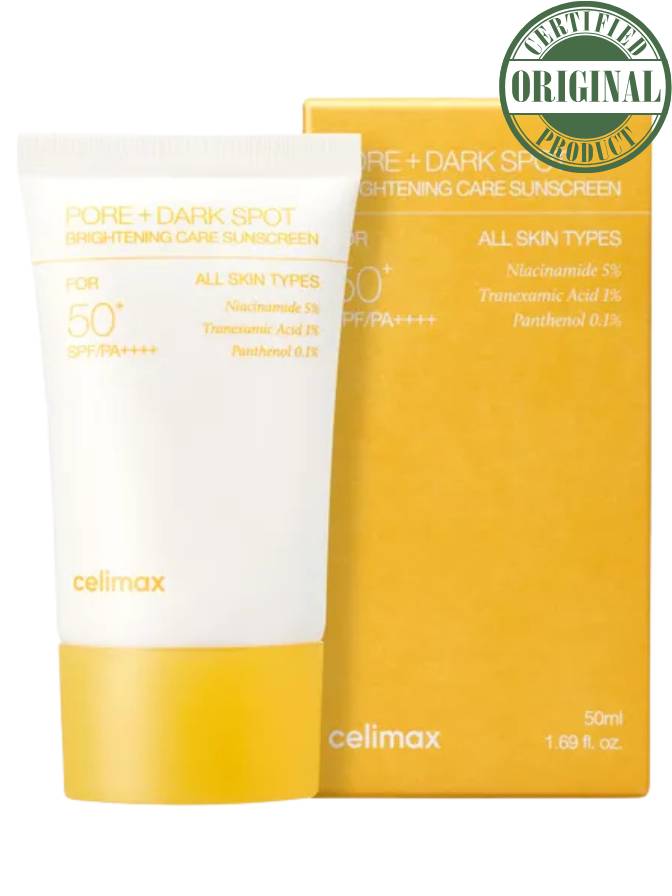 Celimax Pore + Dark Spot Brightening Care Sunscreen SPF50 PA++++ is a high-performance daily sun care solution that protects your skin from harmful UVA/UVB rays while improving skin clarity. Specially formulated to target enlarged pores and dark spots, this Korean sunscreen combines advanced UV protection with brightening care for a smooth, radiant complexion.