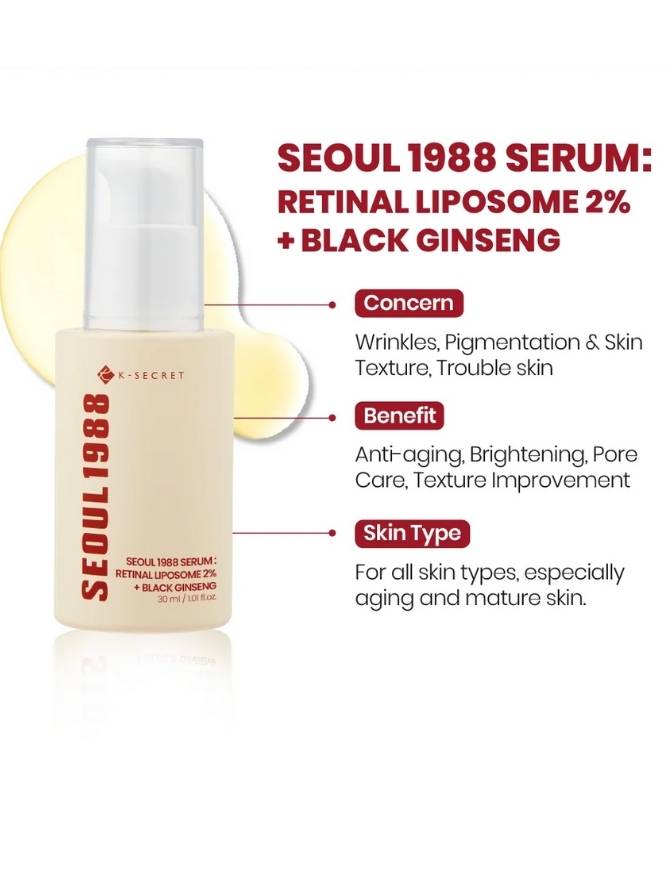 The K-SECRET SEOUL 1988 Retinal Liposome 2%+ Serum is a high-performance Korean anti-aging solution designed to smooth wrinkles, refine skin texture, and restore youthful radiance. With advanced liposome technology, this serum delivers retinal deep into the skin, ensuring maximum absorption and visible results.