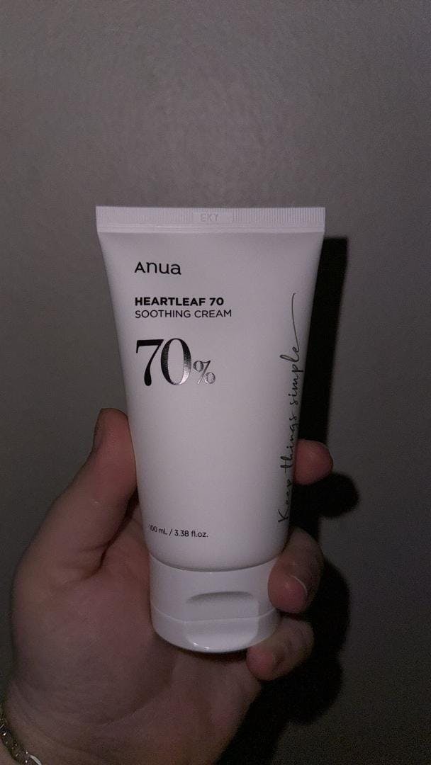 Apply a pea-size amount: Smooth a thin layer of Anua Heartleaf 70% Soothing Cream over face and neck.