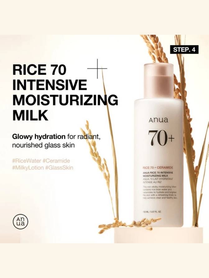 Deep Hydration : Rice 70 Glow Milky Toner and Rice 70 Glow Milk deliver long-lasting hydration, leaving skin plump and dewy.