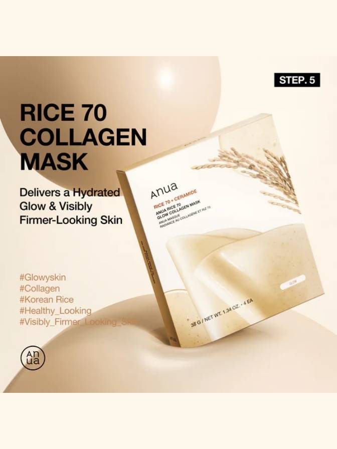 Twice a week, apply Rice 70 Glow Collagen Mask for 15–20 minutes.