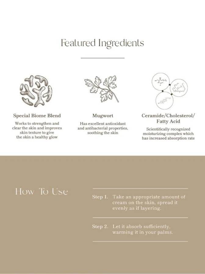 Key Ingredients: Probiotics (Biome Complex), Ceramides, Centella Asiatica, Mugwort, Hyaluronic Acid