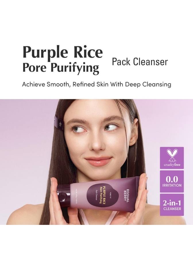The Eqqualberry Purple Rice Pore Purifying Pack Cleanser is crafted to deeply purify pores, remove excess oil, and restore smooth, radiant skin. Powered by nutrient-rich purple rice, vitamins, and natural antioxidants, this 2-in-1 mask-cleanser detoxifies while maintaining essential moisture—making it ideal for daily use. Whether you're dealing with clogged pores, dull texture, or excess sebum, this cleanser delivers a fresh, balanced, and brighter complexion.